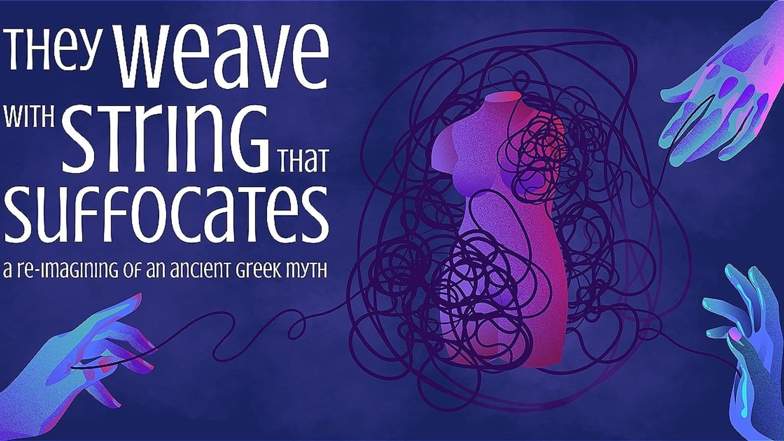 Clotho. Lachesis. Atropos. The Spinner. The Allotter. The End. The Fates observe, the Fates judge, but the Fates never act. Until now. When six blue strings inexplicably appear amongst their sea of red thread, the Fates must weave a new story if they ever want to find an answer. / Klytemnestra. Helen. Kassandra. Iphigenia. Khrysothemis. Elektra. Six women connected through family, war, and a curse. Six women bound by the strings of Fate and wrenched by the whims of man. Six women faced with one question: Is my life my own? / Amidst betrayal, murder, and revenge, these women must confront their destinies and make their final stand. As the Fates seek to understand the strange appearance of the blue strings, the women struggle against their shackles of grief, sorrow, and rage. Will the string that connects them all strangle them in the end? / Long string tethers the performers together, tangling and untangling around them as they weave through the stories of the six women. Through innovative movement and an experimental structure, the rage and contentious autonomy of women from the ancient world to today explodes onstage in this dynamic Greek mythology reimagining.